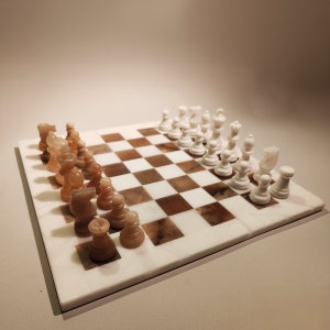 Chess Set in Hand carved Italian Alabaster of Volterra. Genuine Alabaster (Label) - Hand carved - Transparent white and Purple colours. Each piece is equipped with a felt pad.