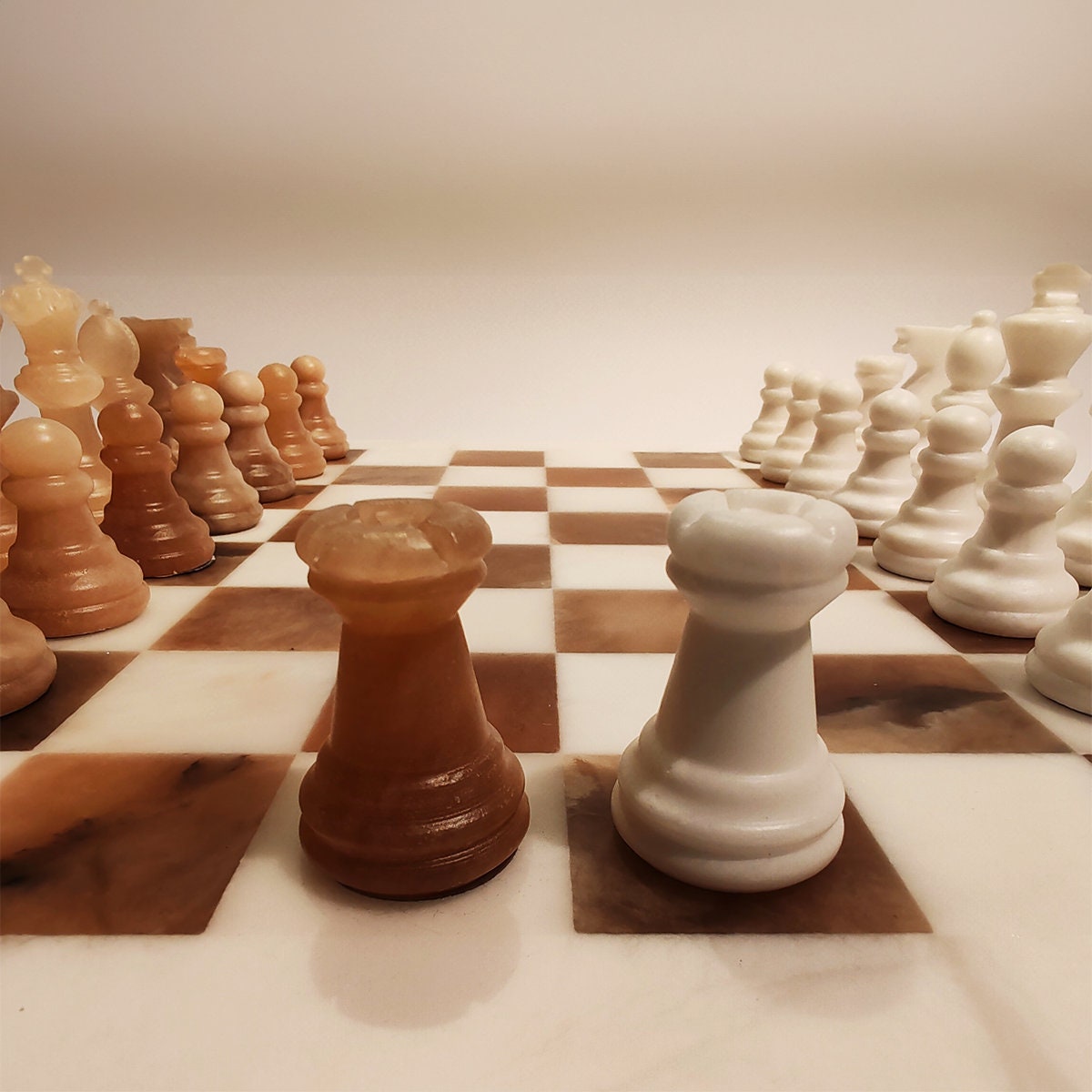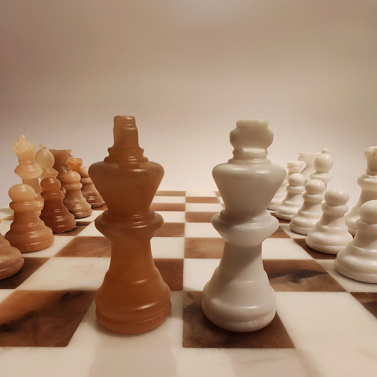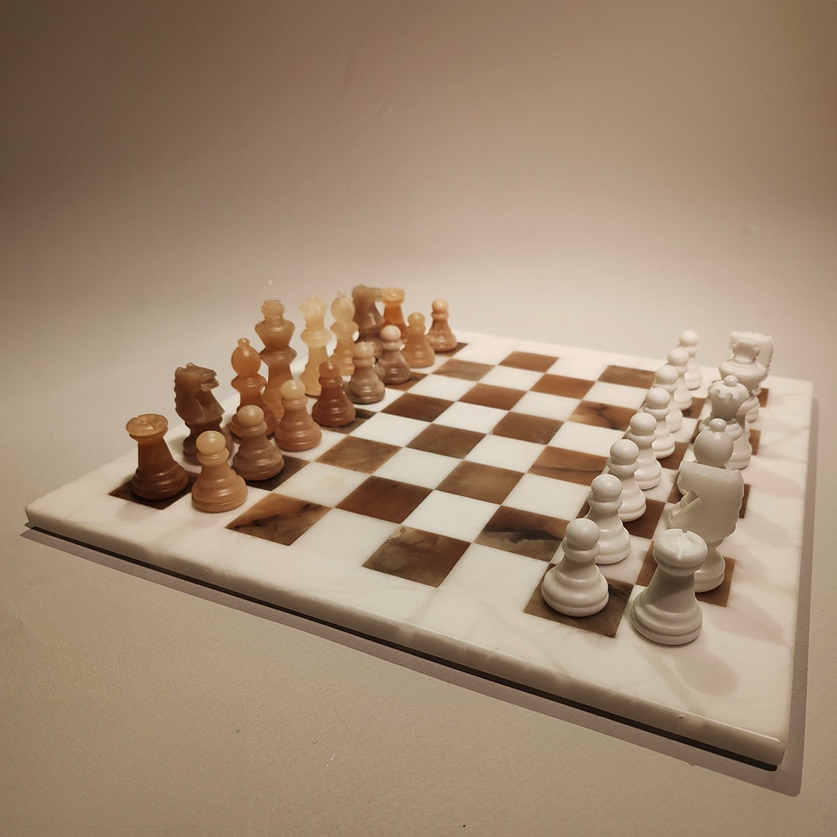 Chess Set in Hand carved Italian Alabaster of Volterra. Genuine Alabaster - Hand carved - White and Natural Agate (Brown). Each piece is equipped with a felt pad.