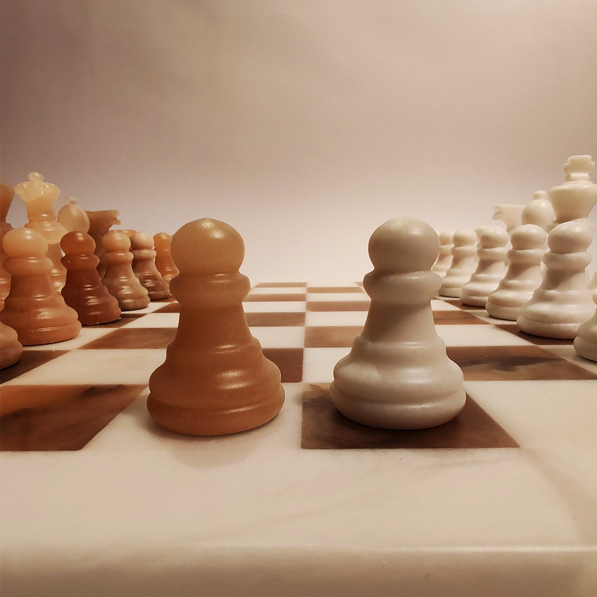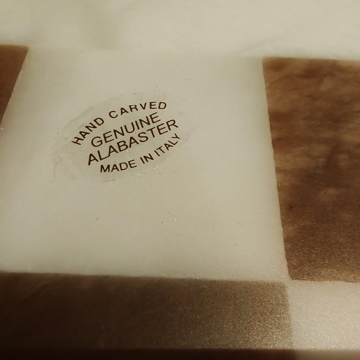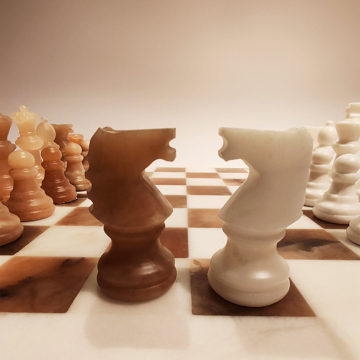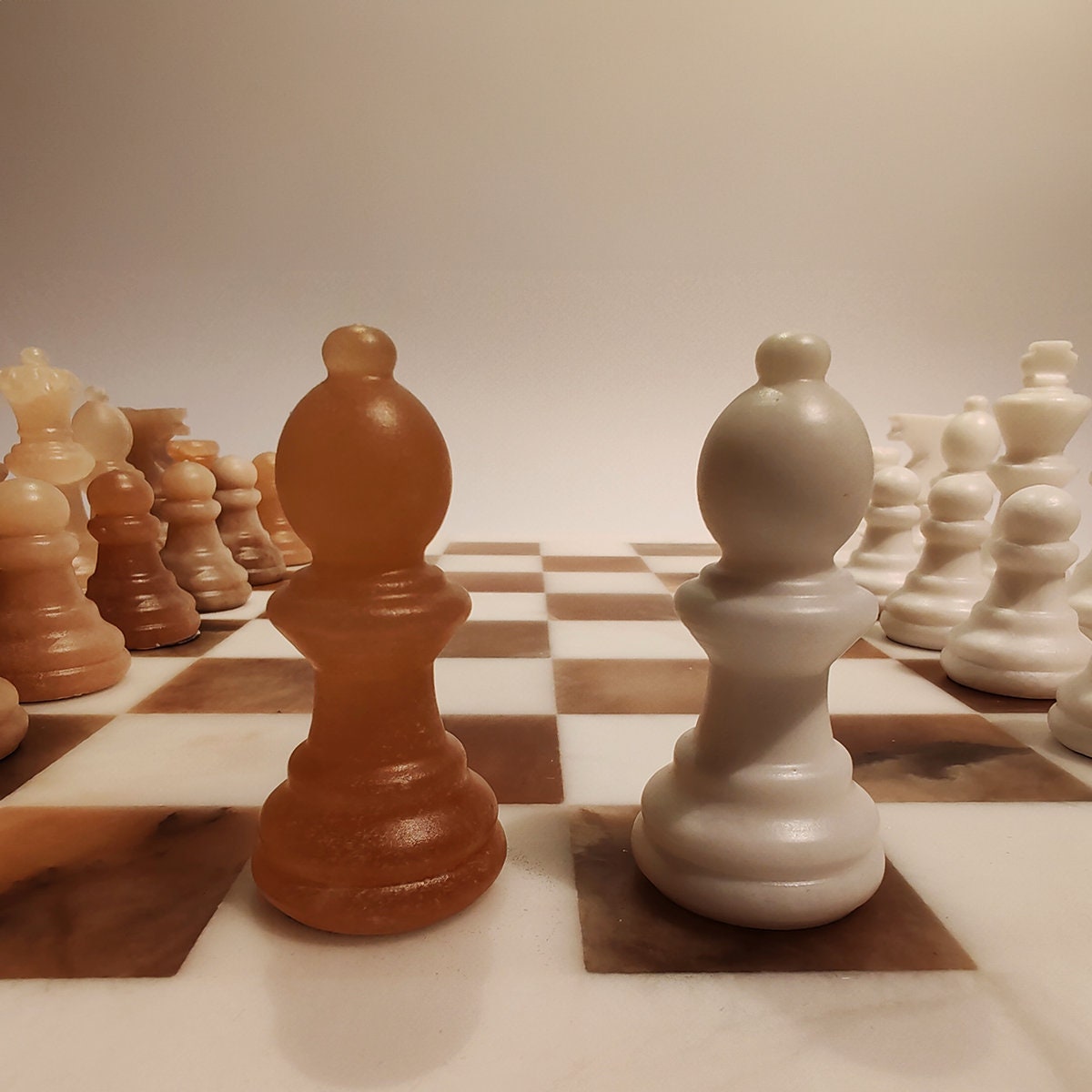 Chess Set in Hand carved Italian Alabaster of Volterra. Genuine Alabaster - Hand carved - White and Natural Agate (Brown). Each piece is equipped with a felt pad.