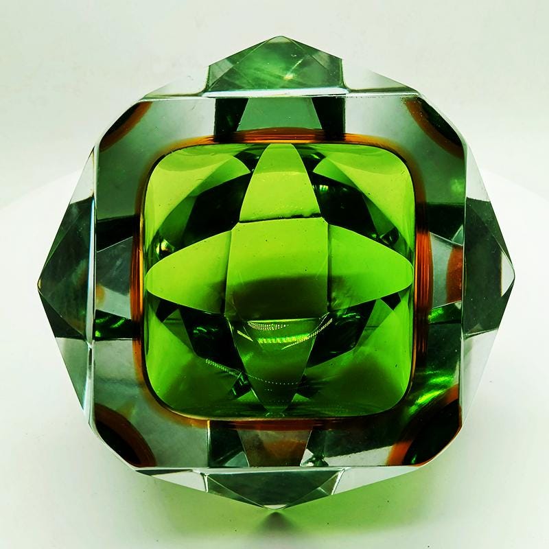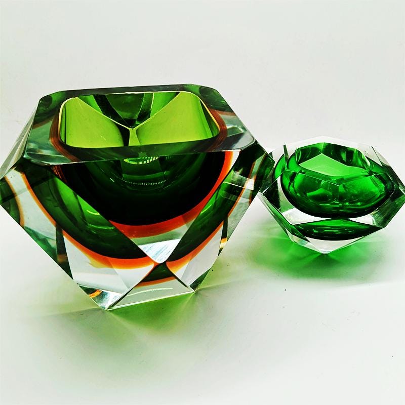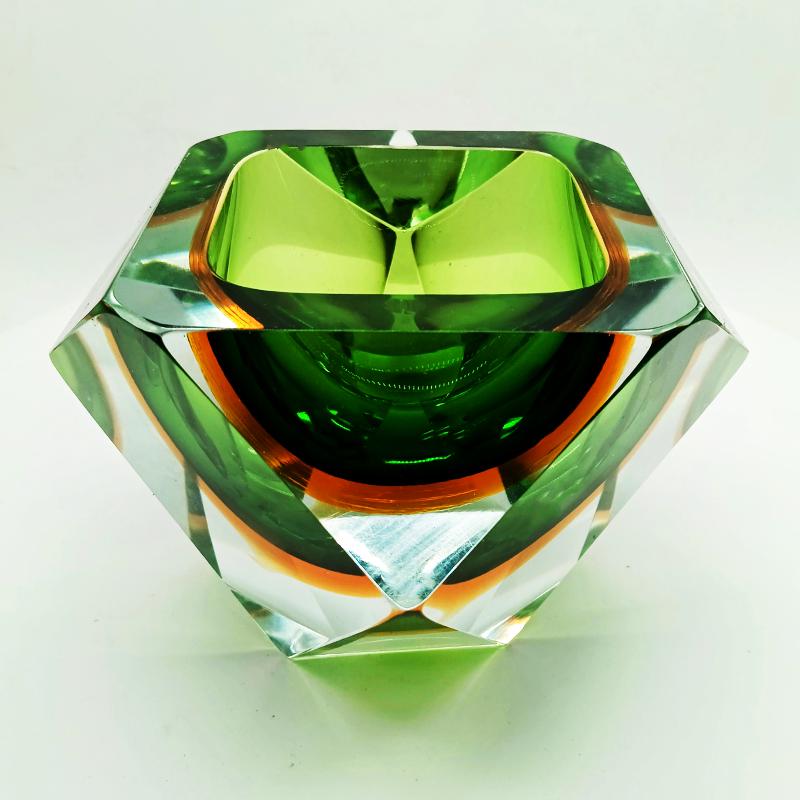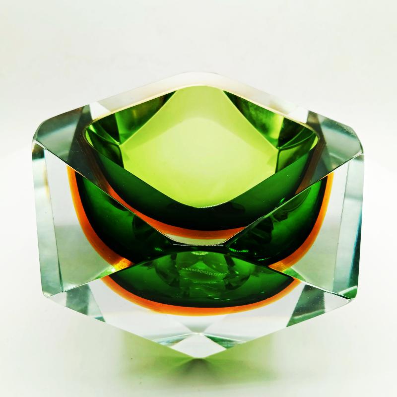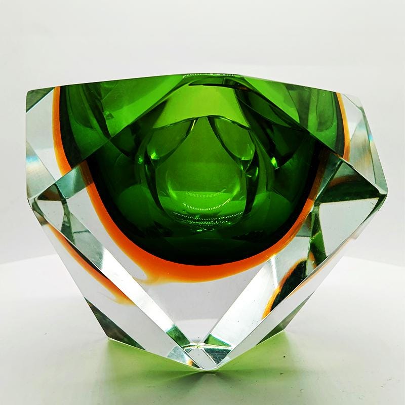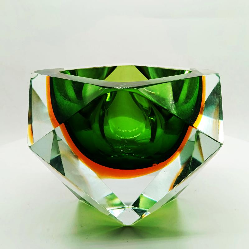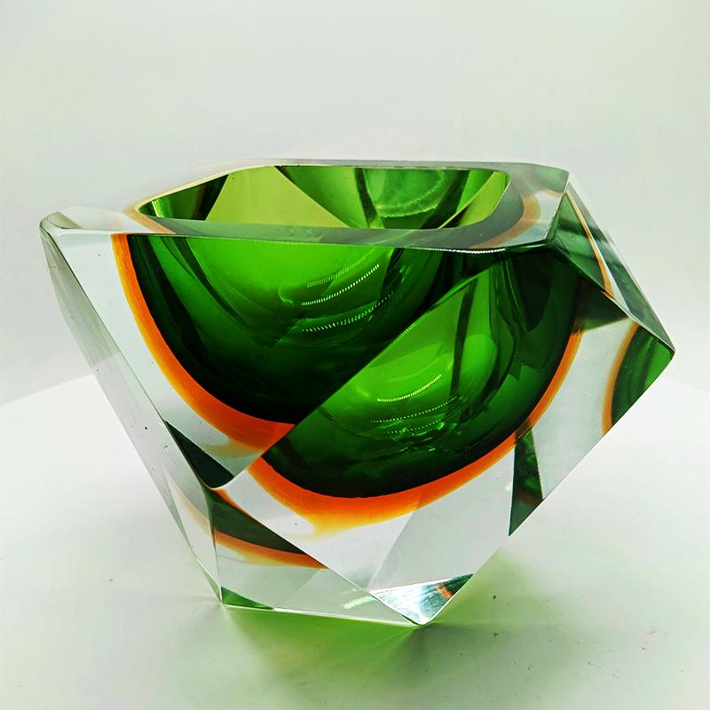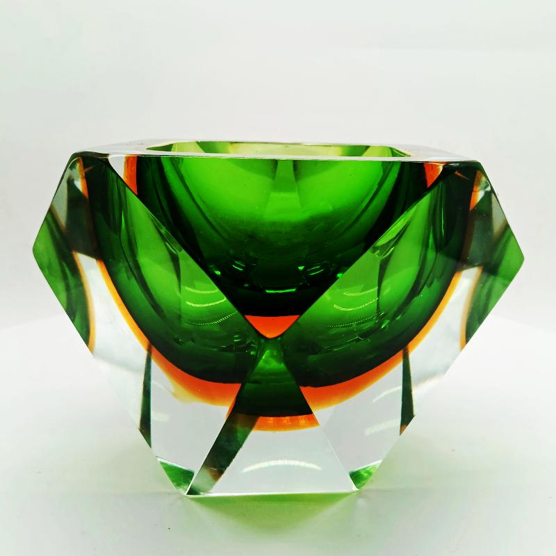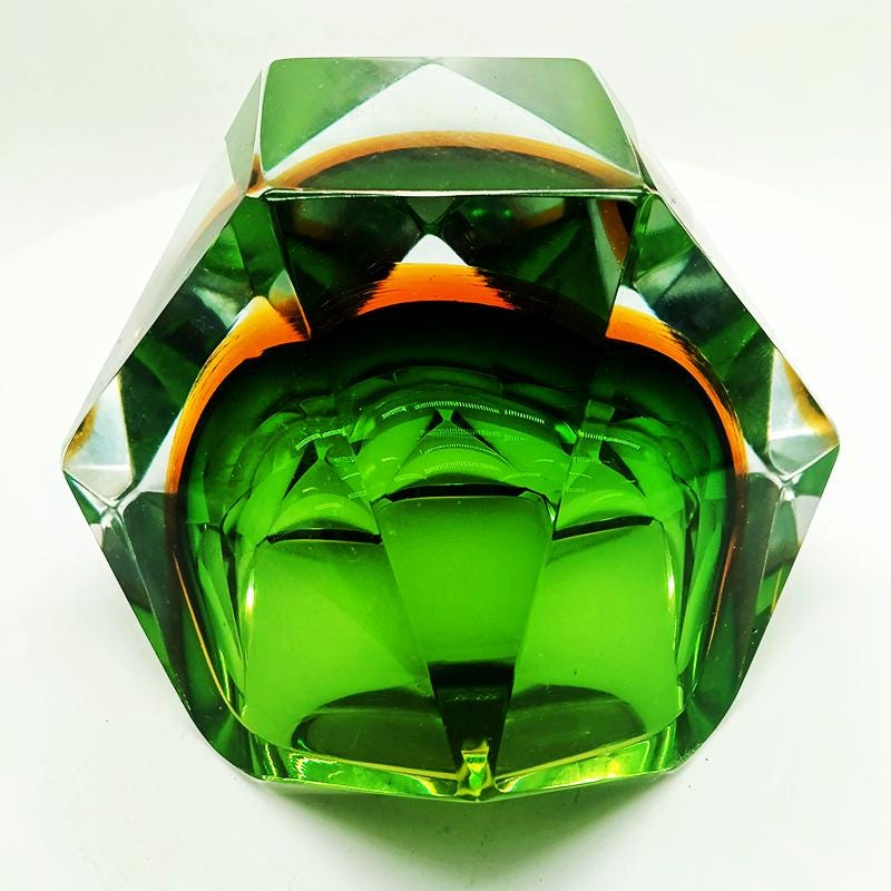 Huge Ashtray or Catch-all in Murano Glass by Flavio Poli for Seguso. Truly Big with its 20 cm - 7.87 inches of width and 13 cm - 5.11 inches of height. Absolutely Spectacular and Heavy with Two Submerged colors Green and Golden Orange. A decidedly rare item for its very important dimensions.