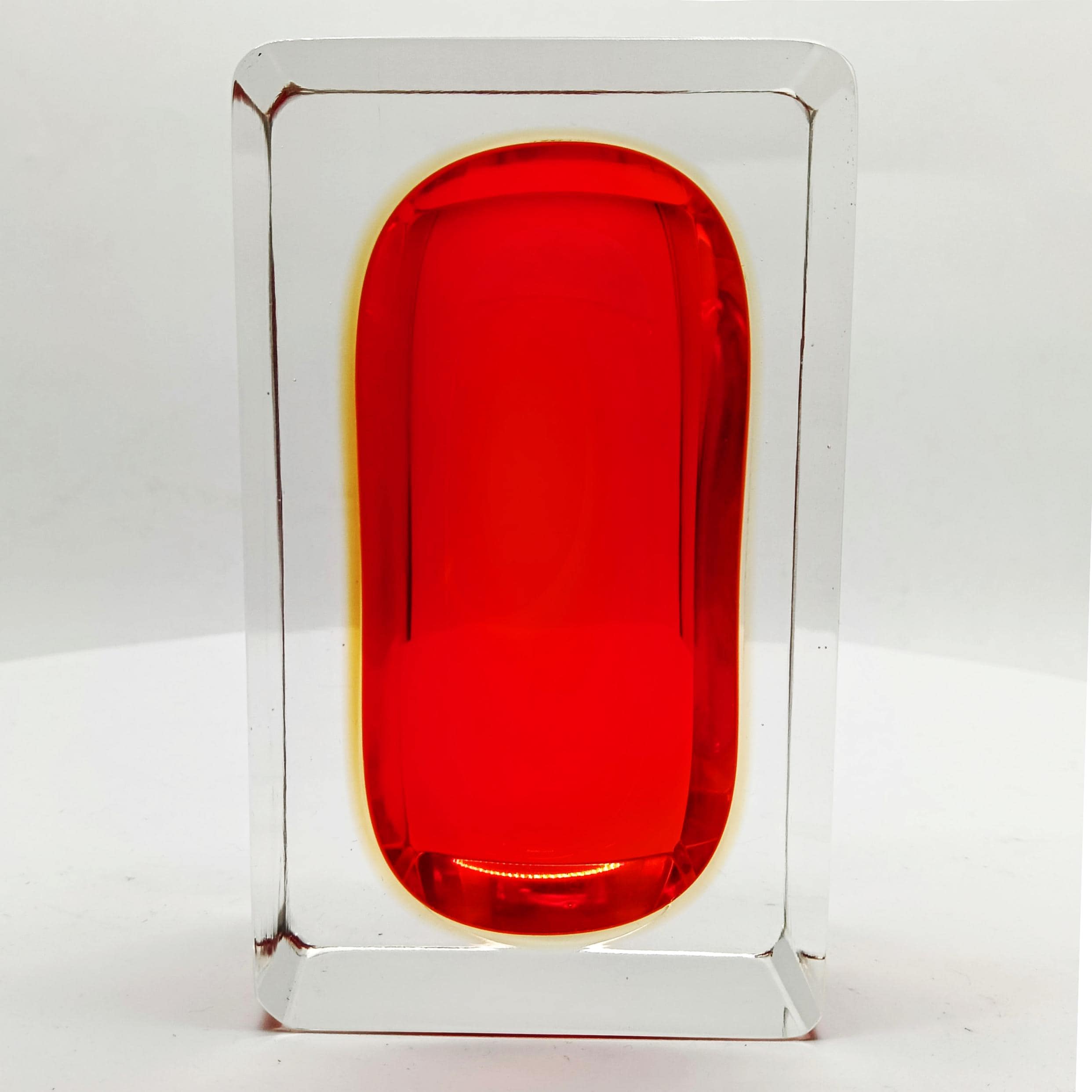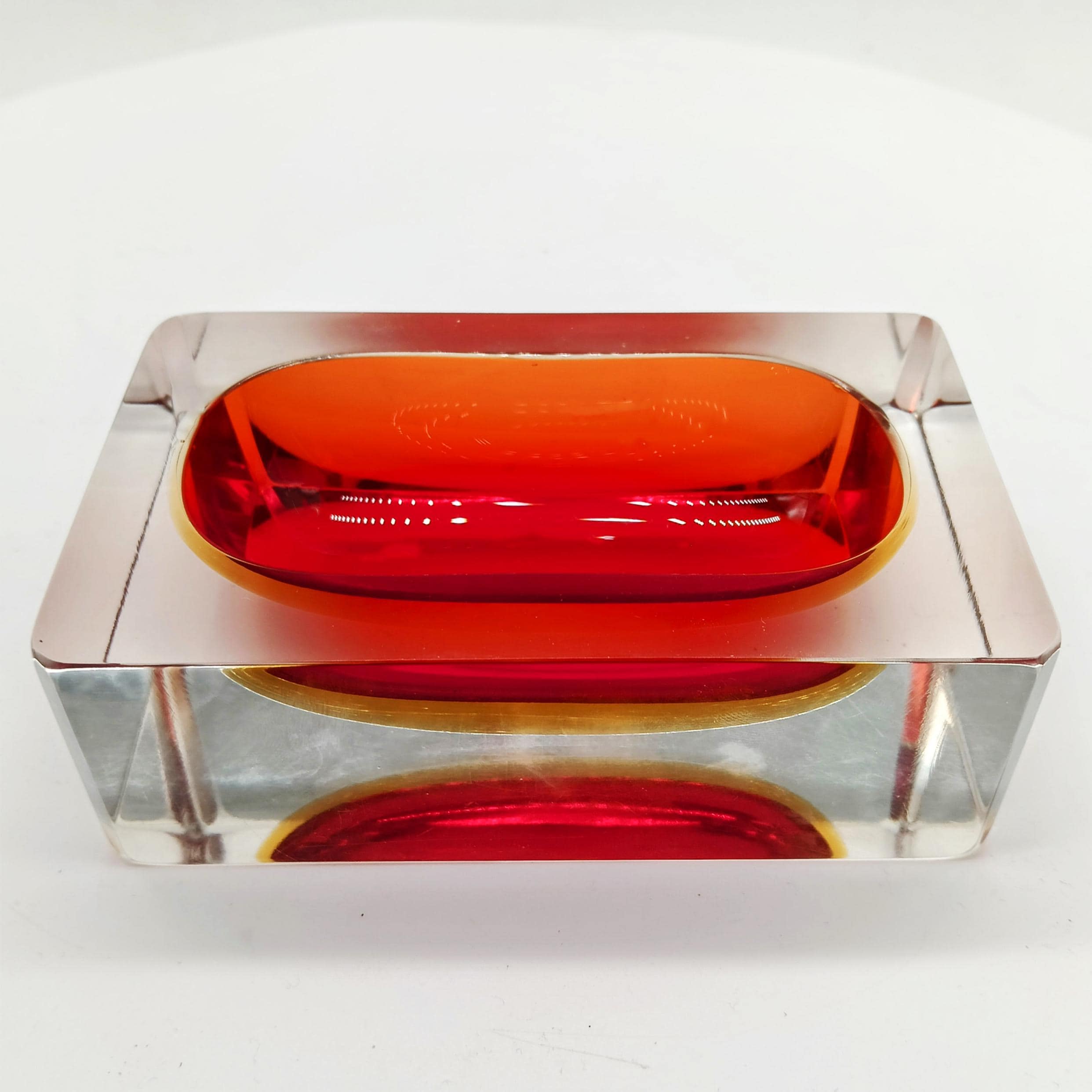 Stunning Rectangular Ashtray or Catch-all in Murano Glass by Flavio Poli for Seguso. Two Submerged colors: Red and Golden Yellow. Rare item due to its Faceted Sides.