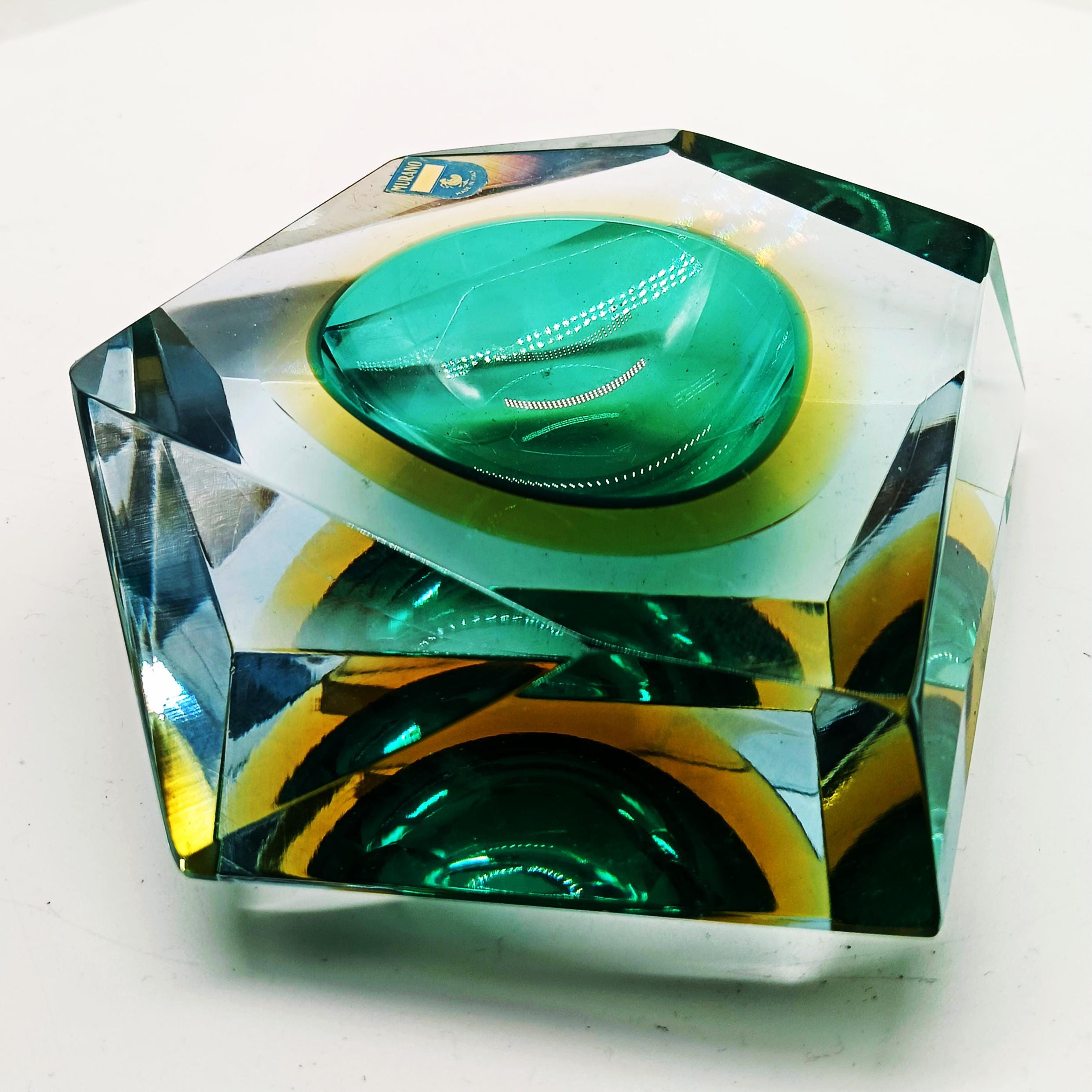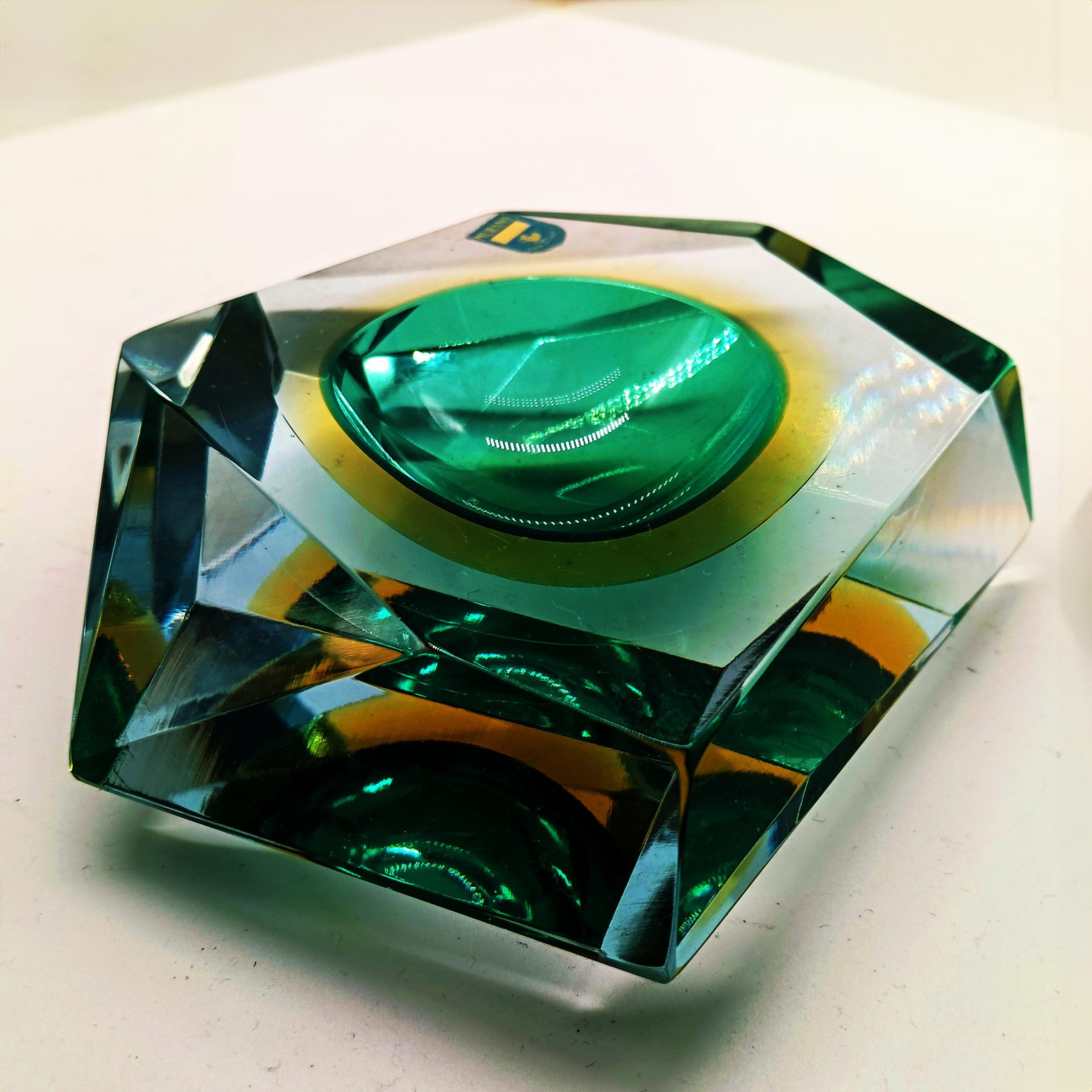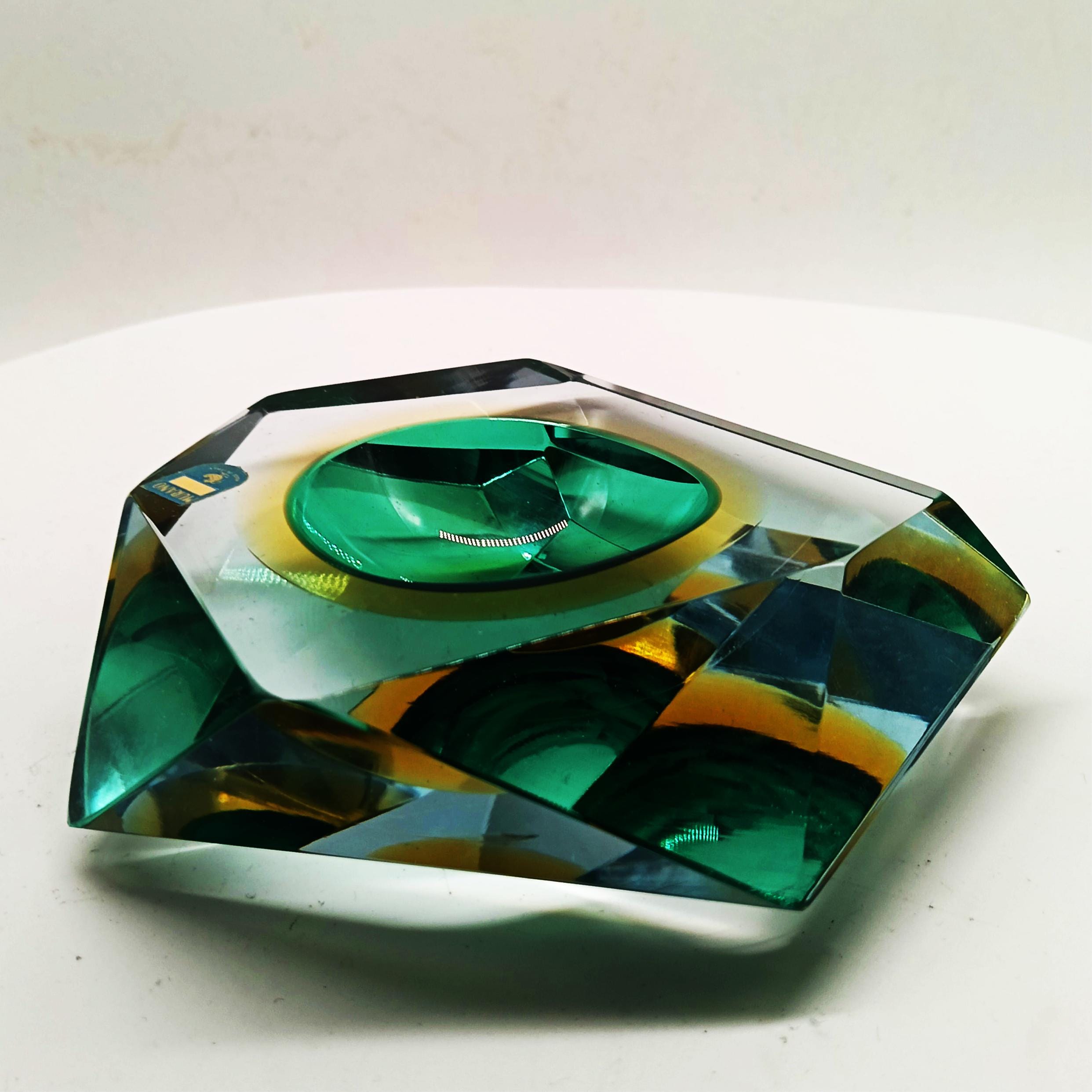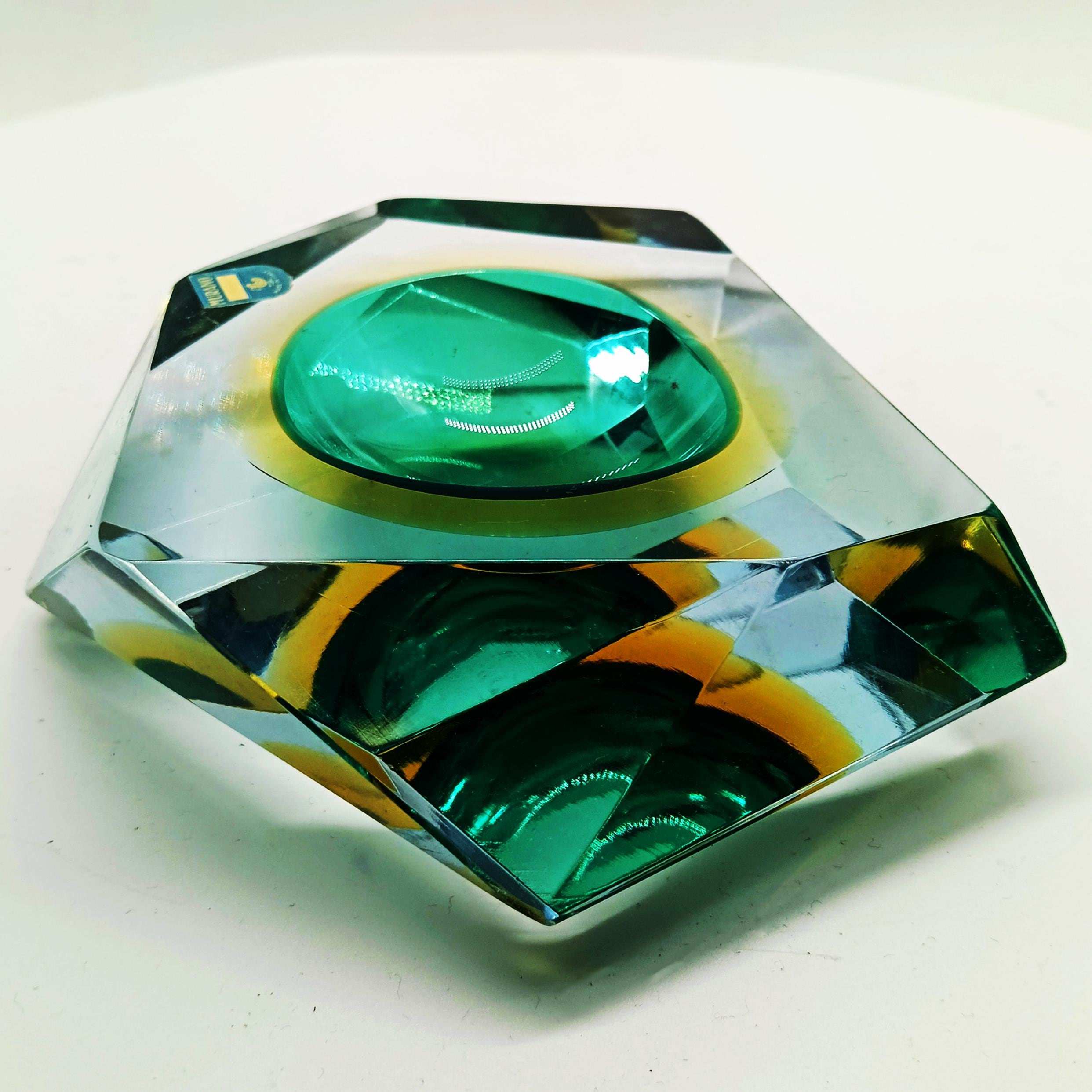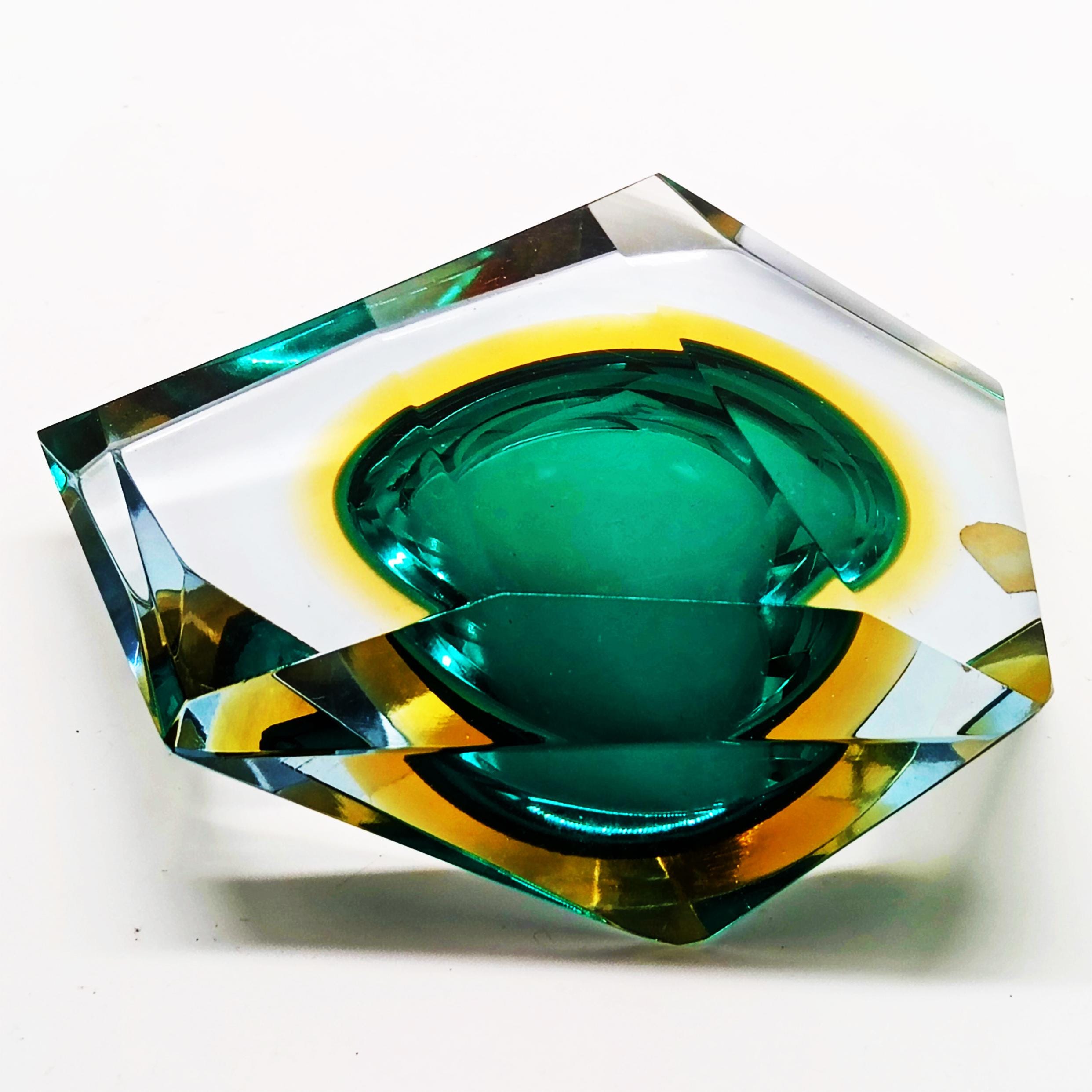 Asymmetrical Multifaceted Ashtray or Catch-all in Murano Glass by Flavio Poli. Two Submerged colors: Green and Golden Yellow .