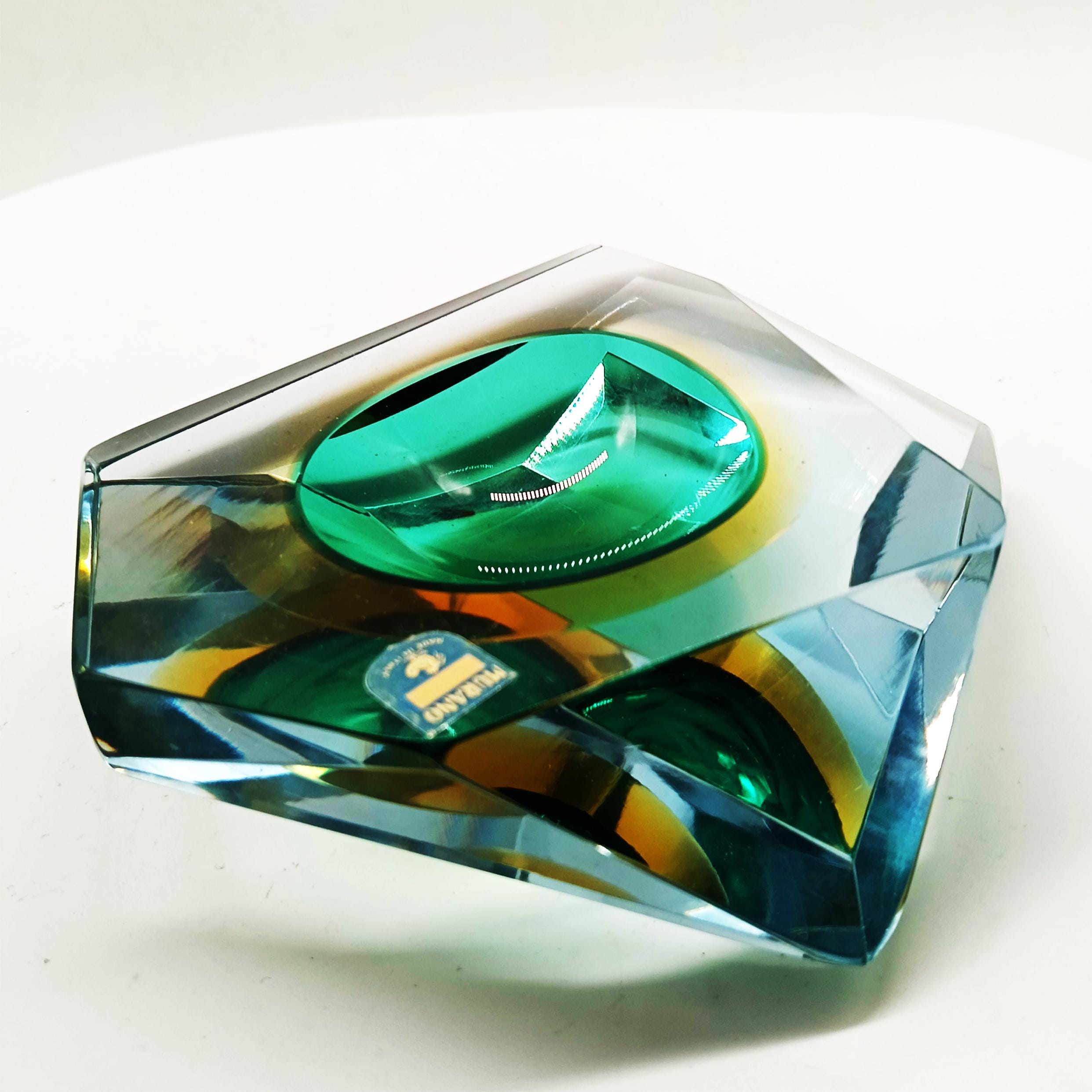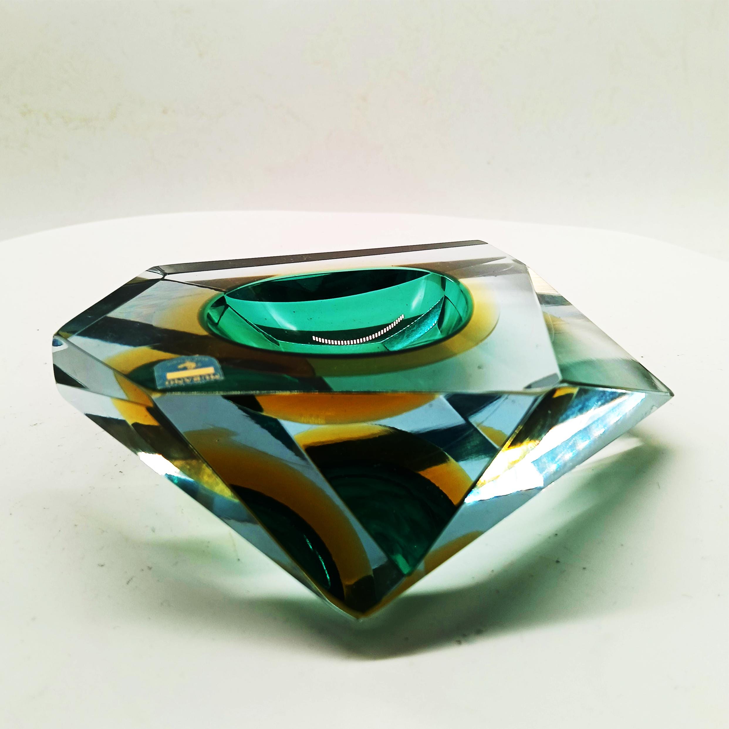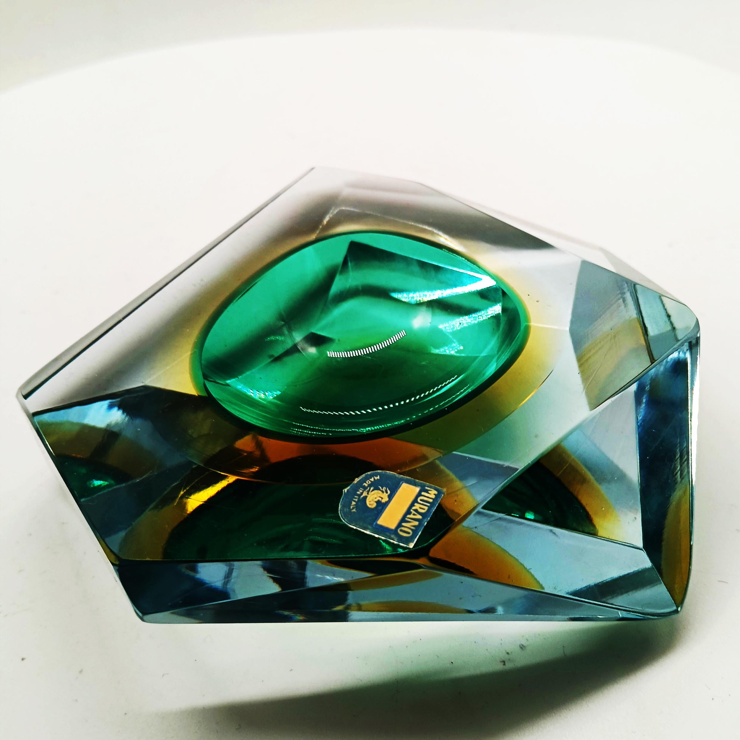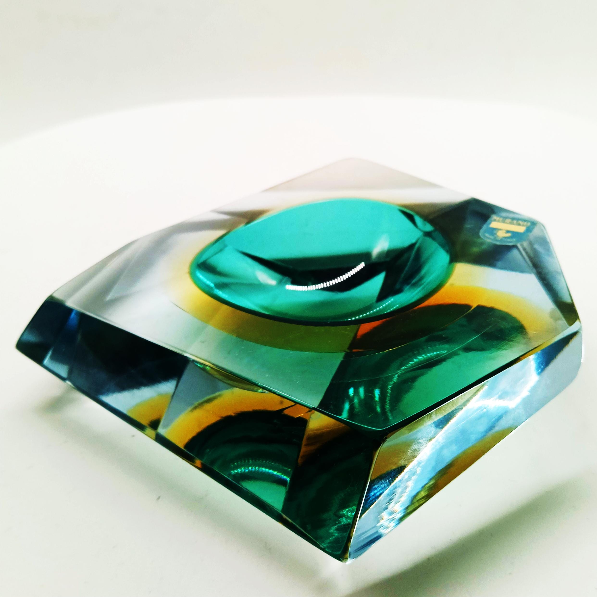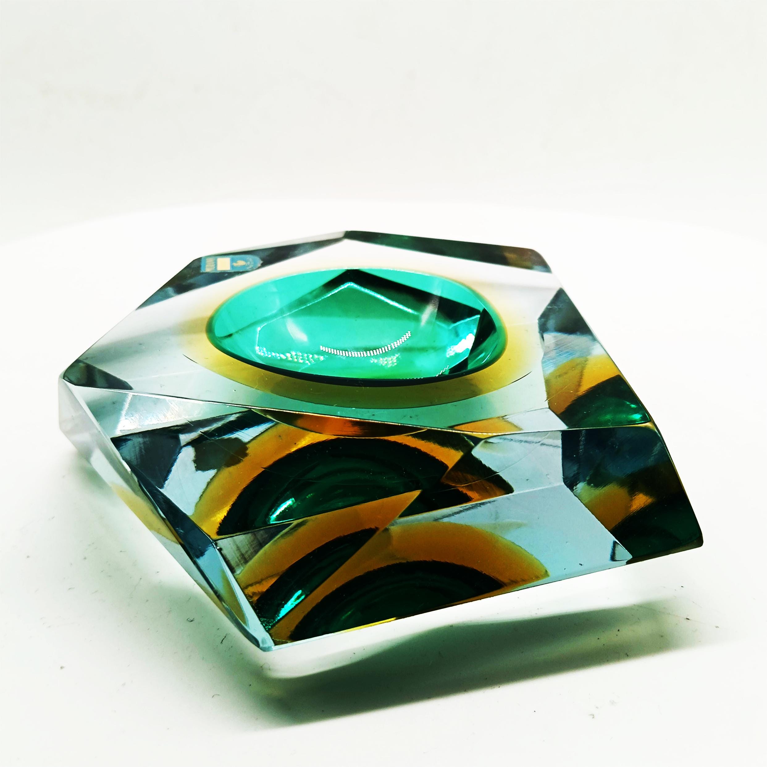 Asymmetrical Multifaceted Ashtray or Catch-all in Murano Glass by Flavio Poli. Two Submerged colors: Green and Golden Yellow .