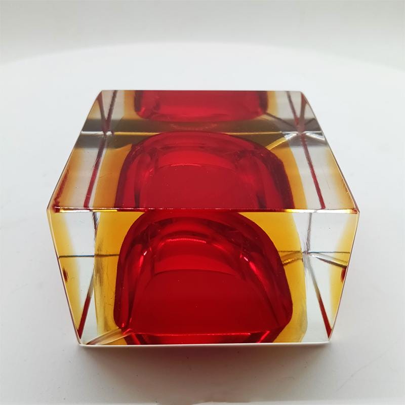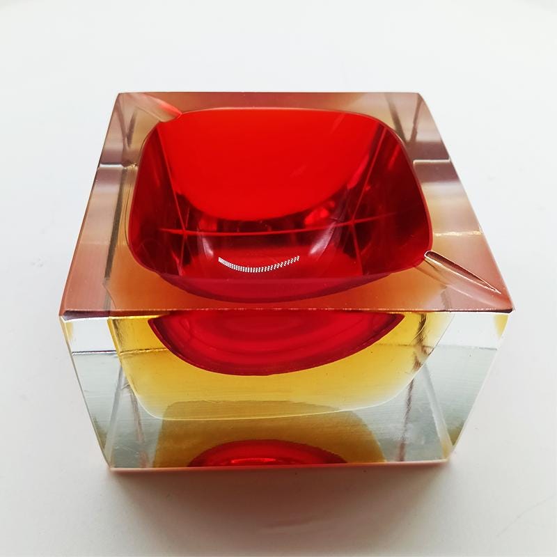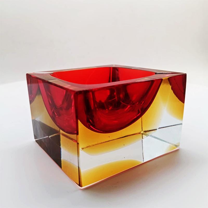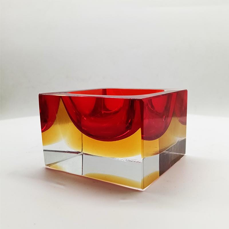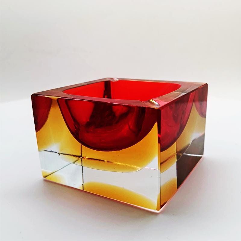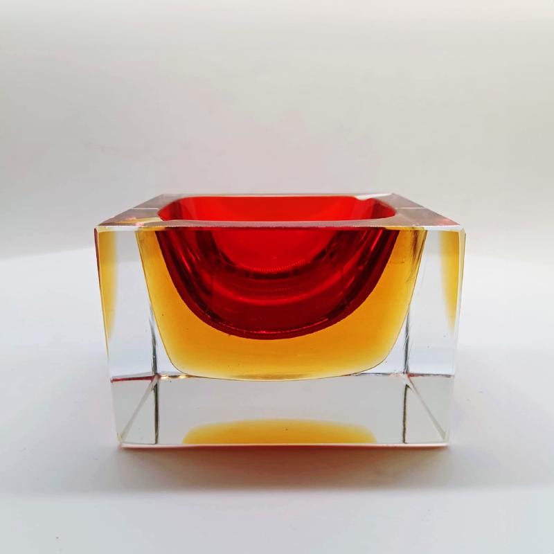 Square Ashtray or Catch-all in Murano Glass by Flavio Poli for Seguso. Stunning Red and Golden Yellow Submerged colors.