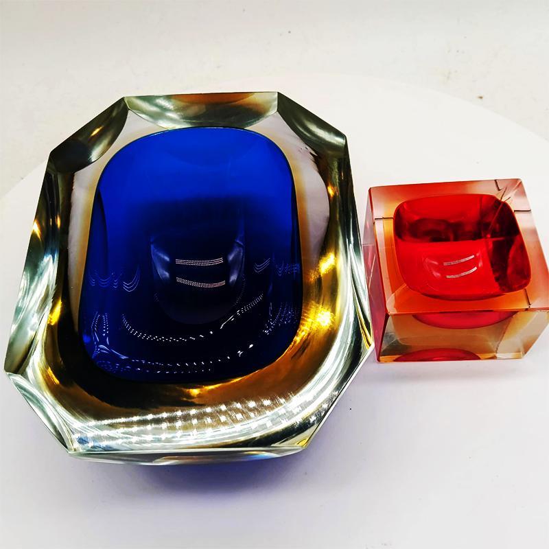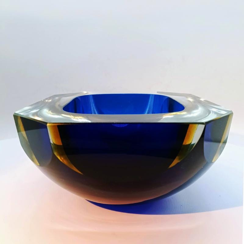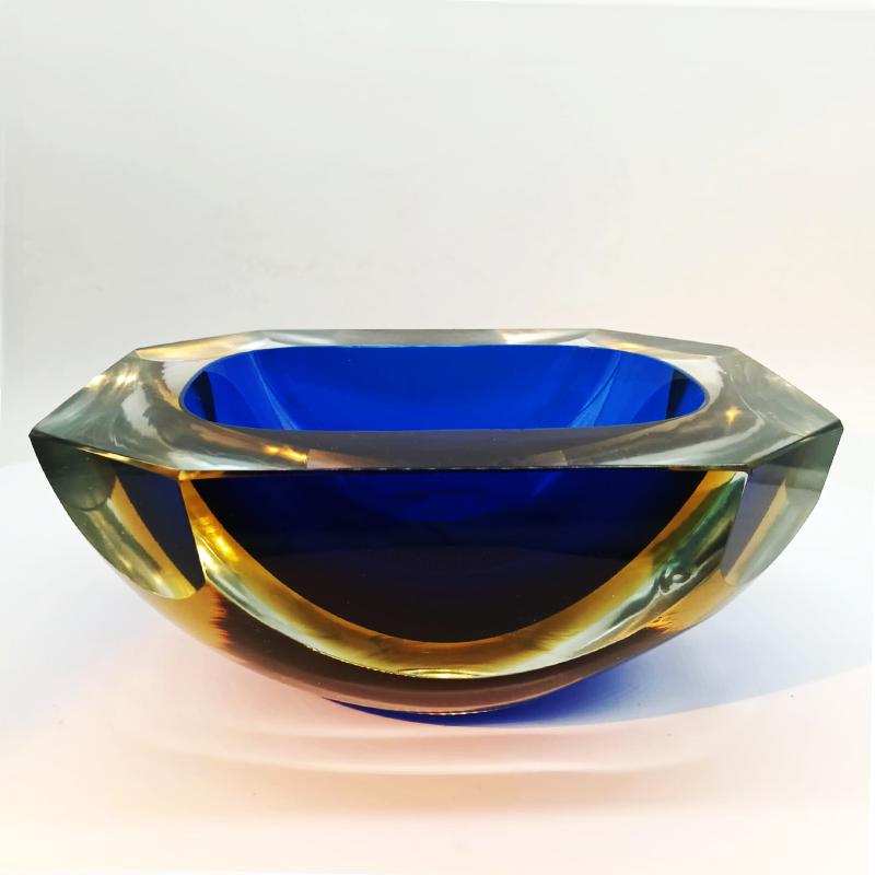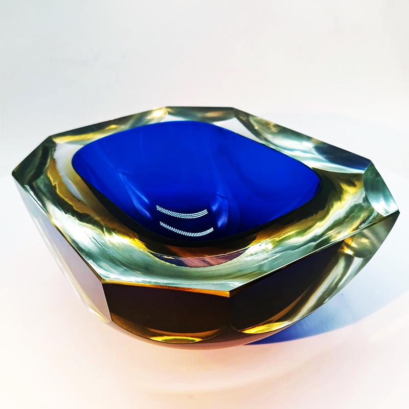 Very Big Multifaceted Ashtray or Catch-all in Murano Glass by Flavio Poli. Stunning Blue and Golden Yellow submerged colors.