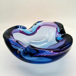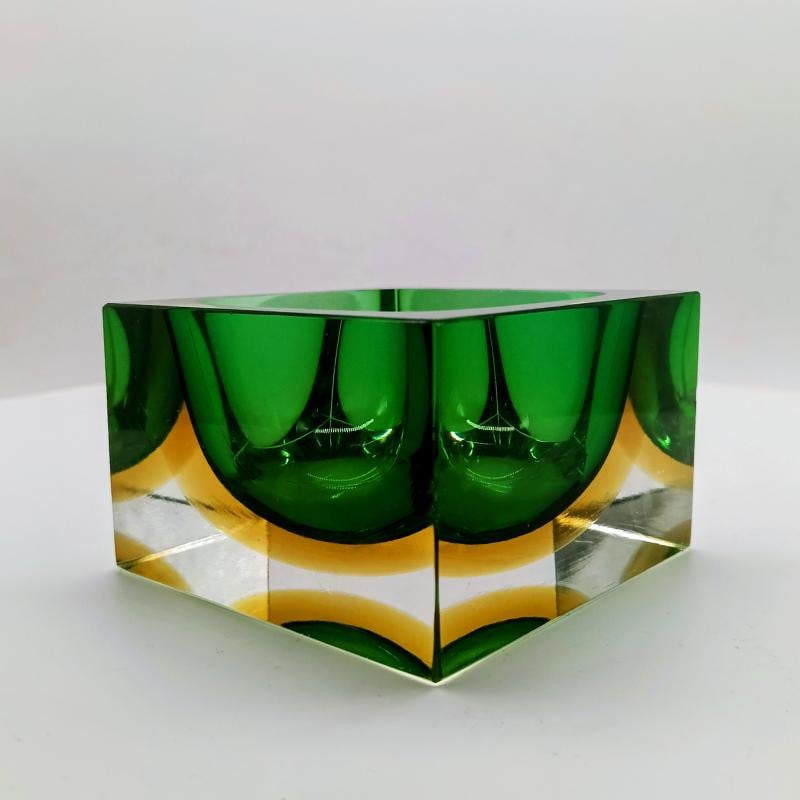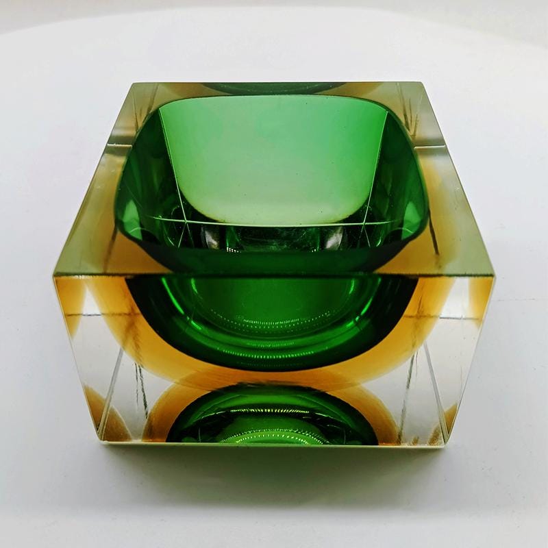 Square Ashtray or Catch-all in Murano Glass by Flavio Poli for Seguso. Stunning Green and Golden Orange Submerged colors.