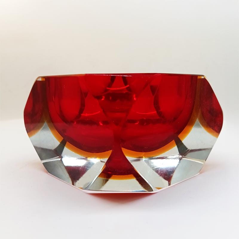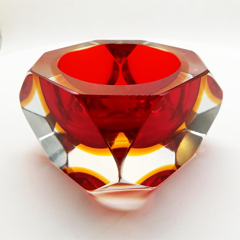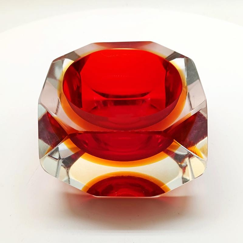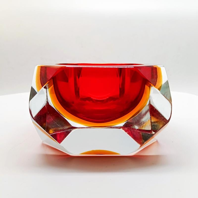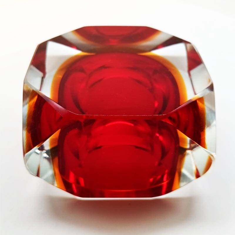 Stunning Square Ashtray or Catch-all in Murano Glass by Flavio Poli for Seguso. Multifaceted shape, Two Amazing Submerged colors: Red and Golden Yellow.
