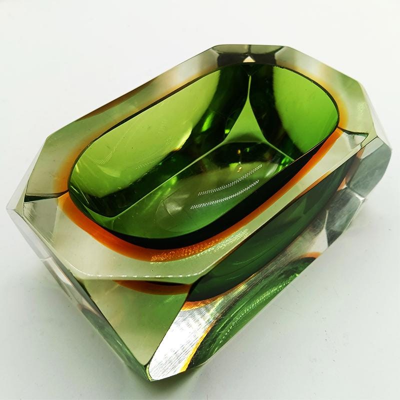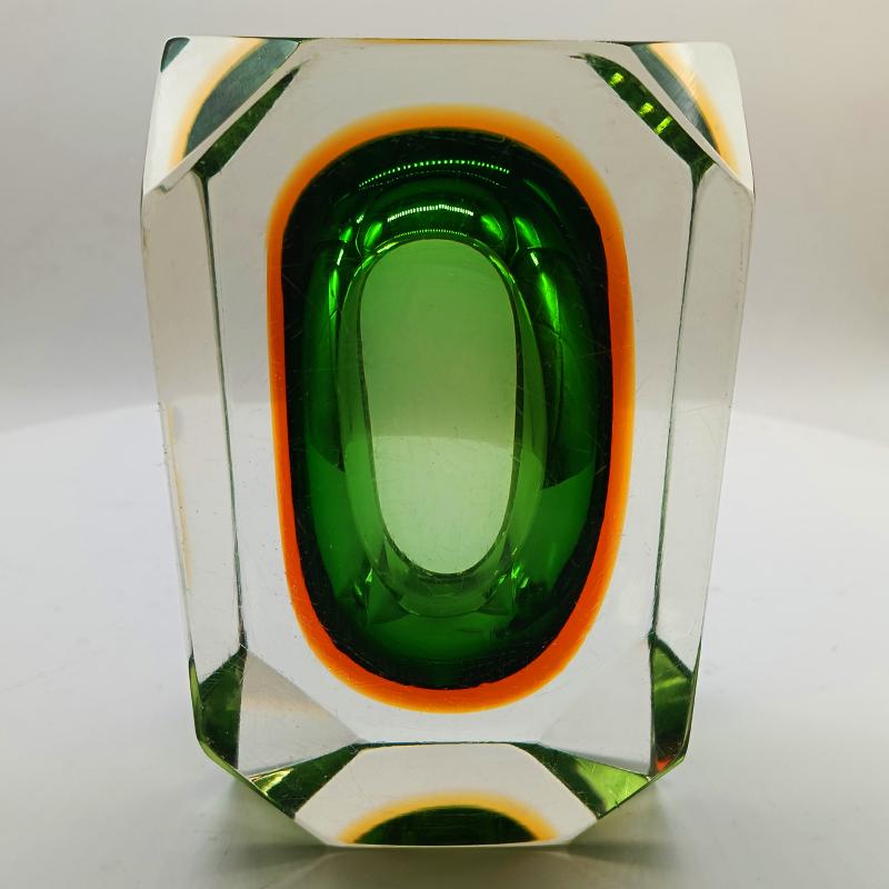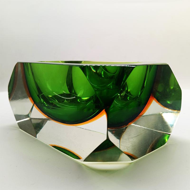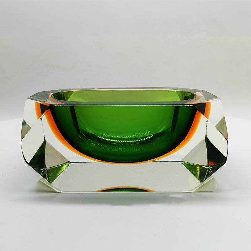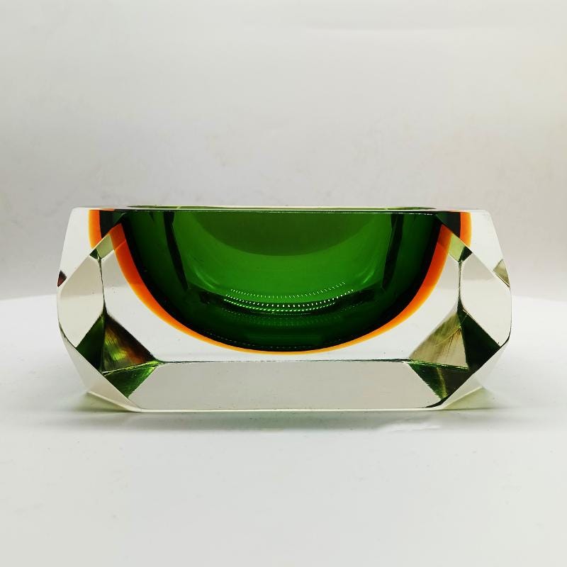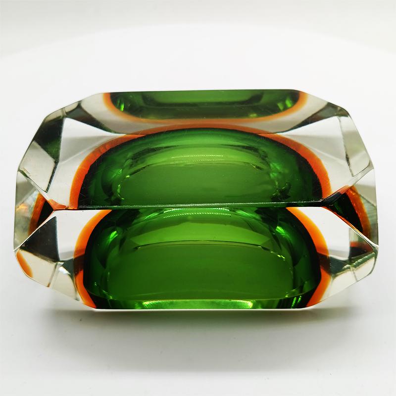 Stunning Rectangular Ashtray or Catch-all in Murano Glass by Flavio Poli for Seguso. Rare item in this Multifaceted shape and in these Two Amazing Submerged colors: Green and Golden Orange.