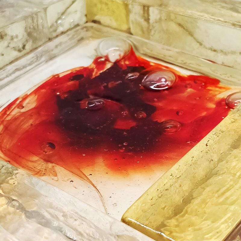 The bubbles on the outer gold/transparent part are visible but are under the surface and are intact (in the photos they may look like breaks but they are not). Those of the internal red part are intact and in relief.