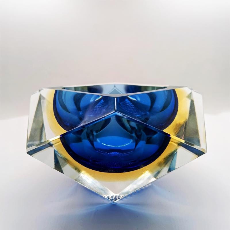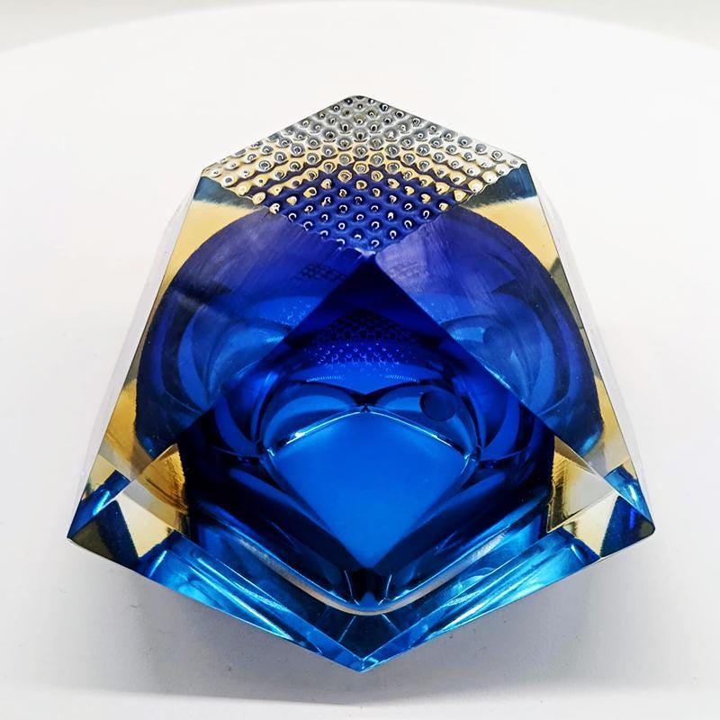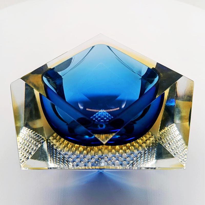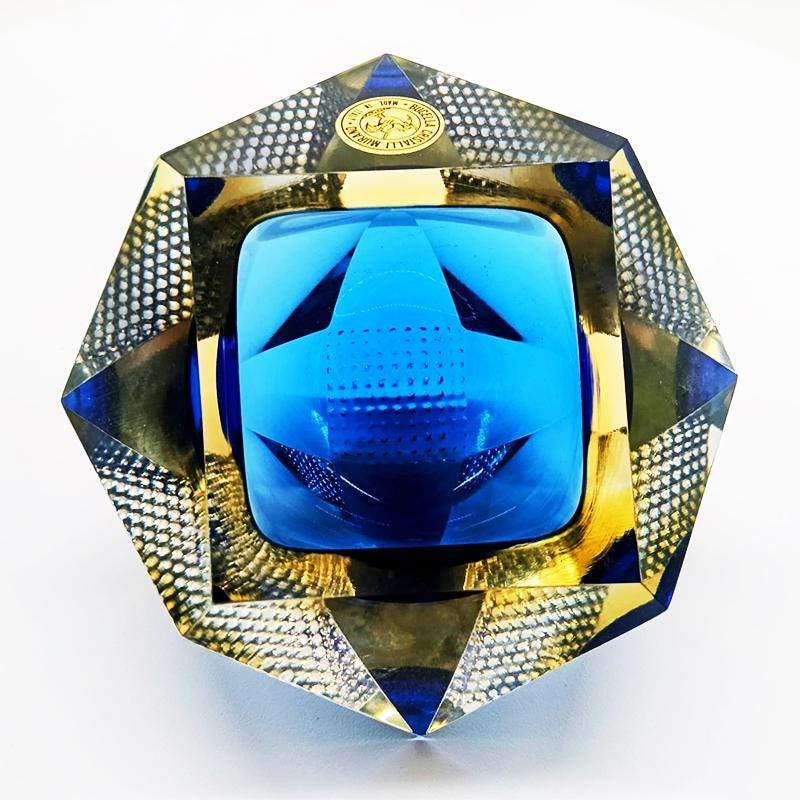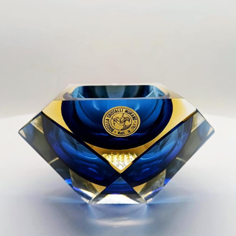 Ashtray or Catch-all in Murano Glass by Flavio Poli for Seguso. Produced by Vetrerie Bucella Murano - Label Blue and Golden Yellow Submerged colors.