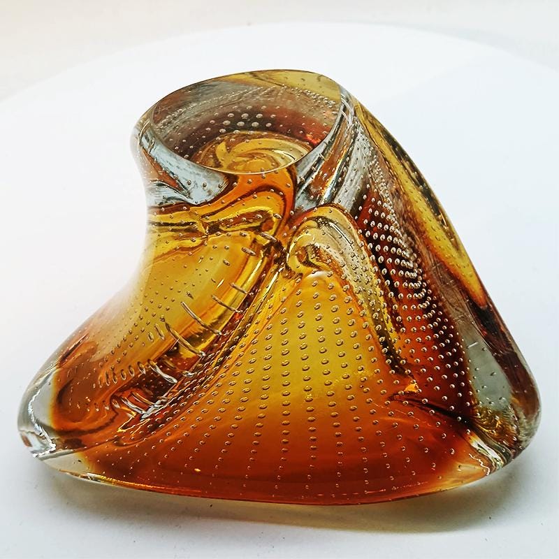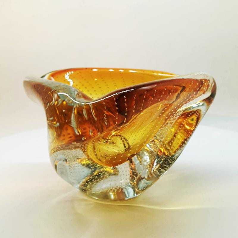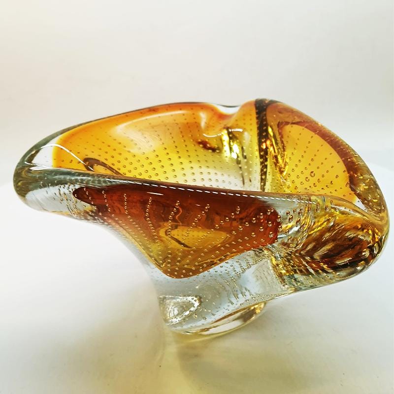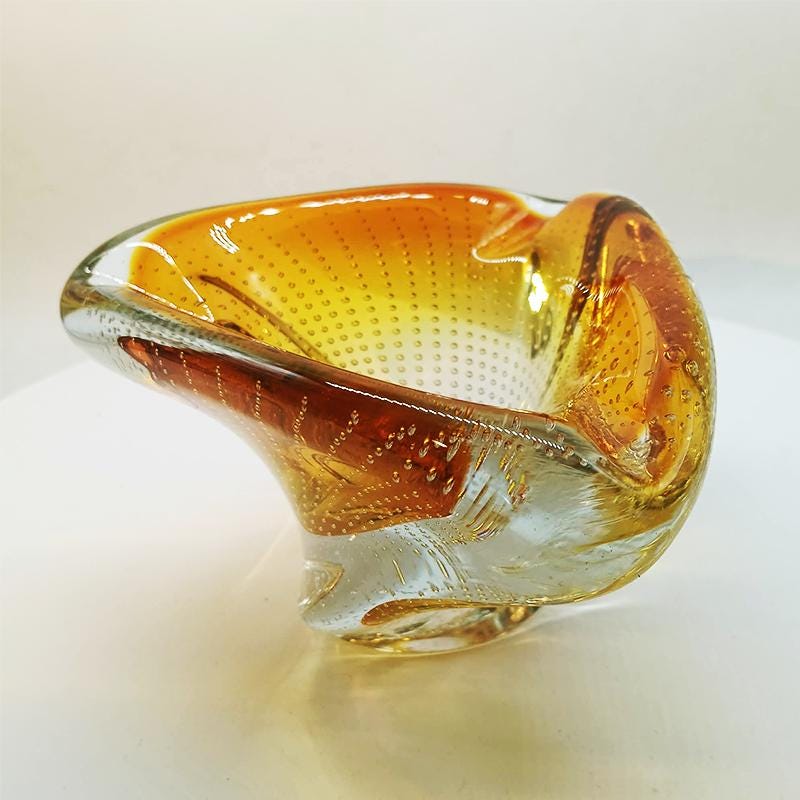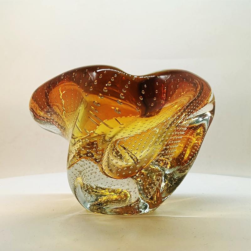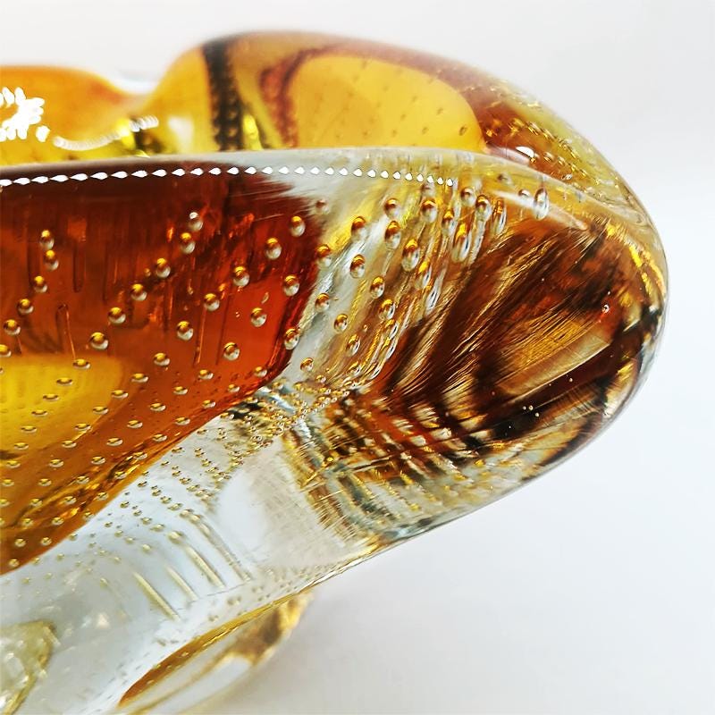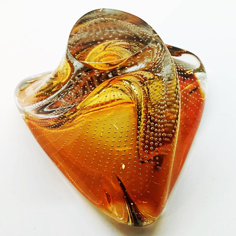 Big Vintage Triangular Ashtray - Centerpiece or Catch-all in Murano Glass. Stunning Amber and Golden Yellow submerged colors with Air Bubble. Hand Worked.