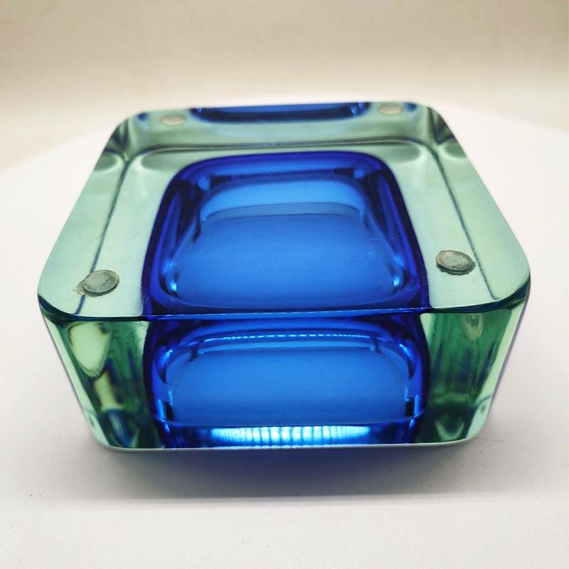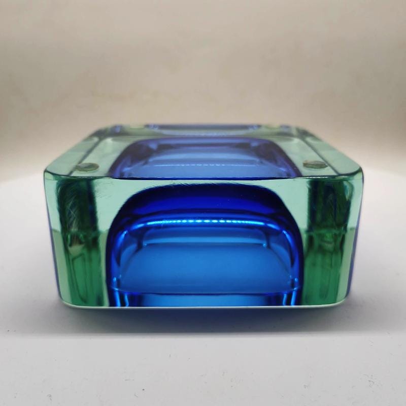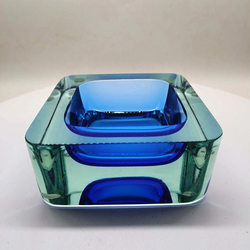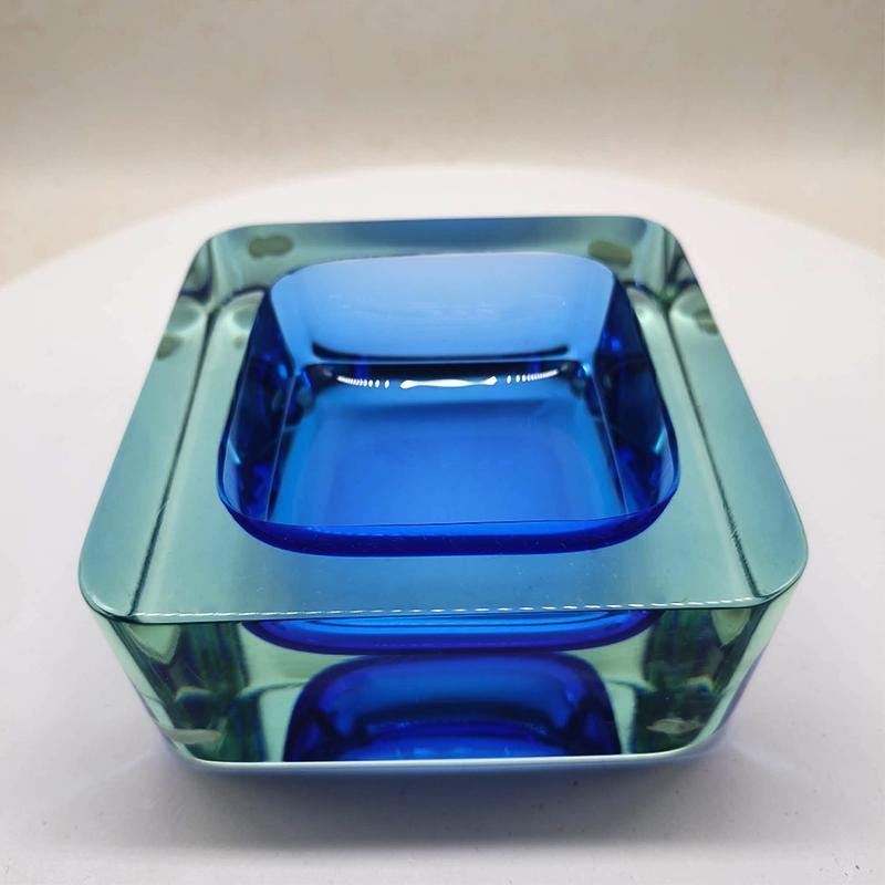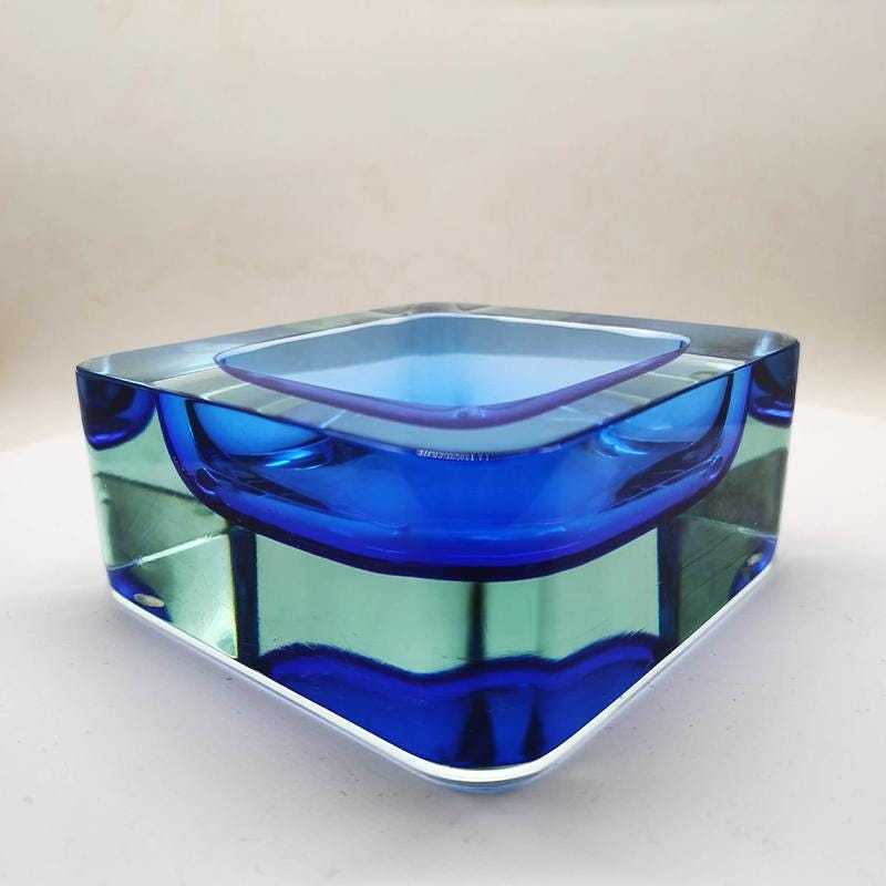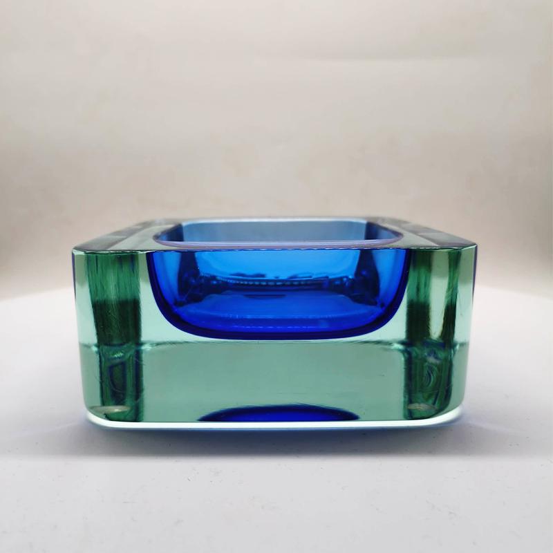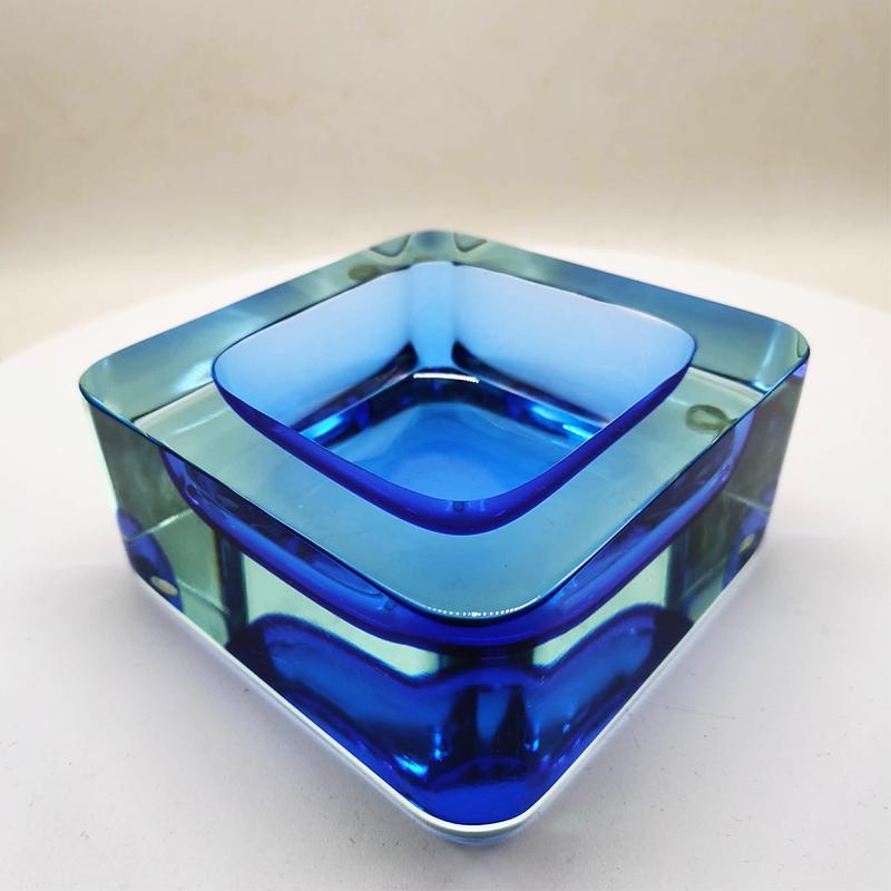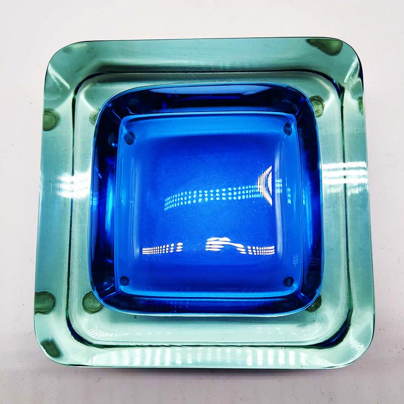 Big Square Ashtray or Catch-all in Murano Glass with Rounded Corners. Two stunning underwater colors: Aquamarine and Blue Handcrafted.