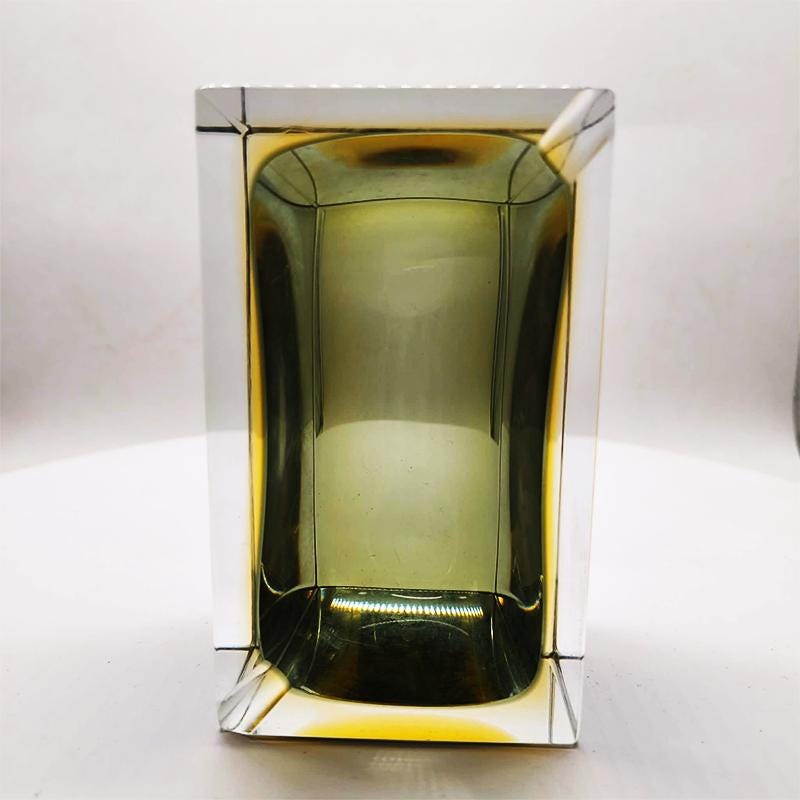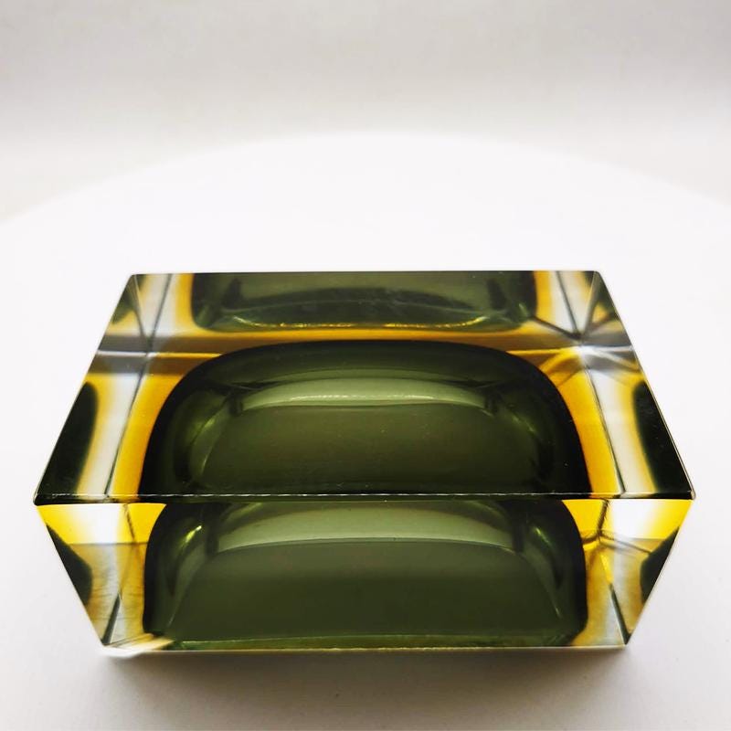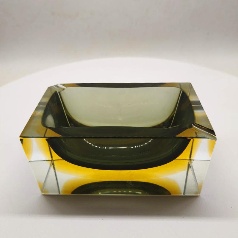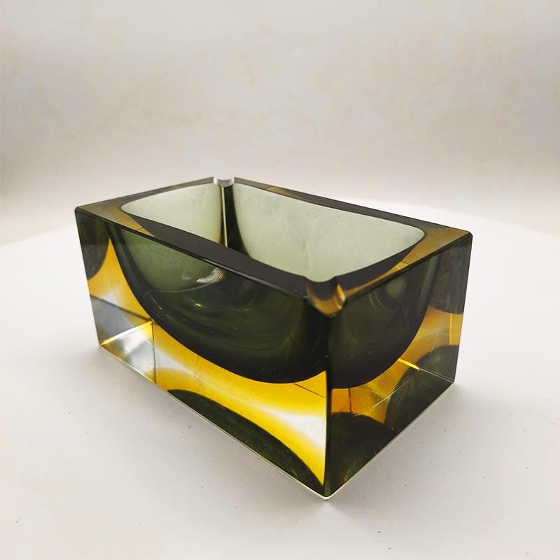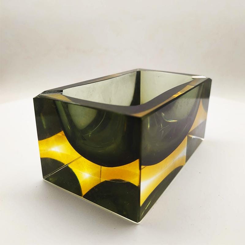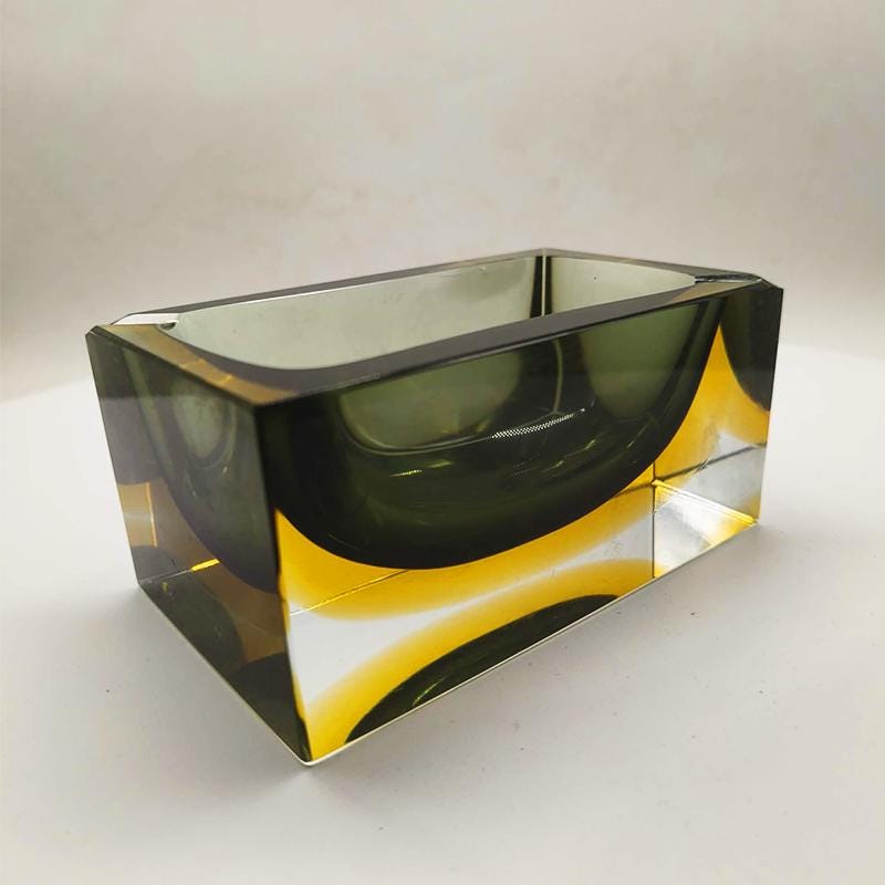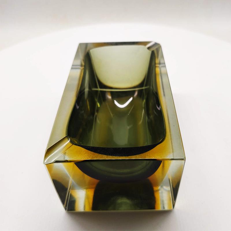 Vintage Big Rectangular Ashtray or Catch-all in Murano Glass by Flavio Poli for Seguso. Two Stunning Submerged colors: Forest Green and Golden Yellow.